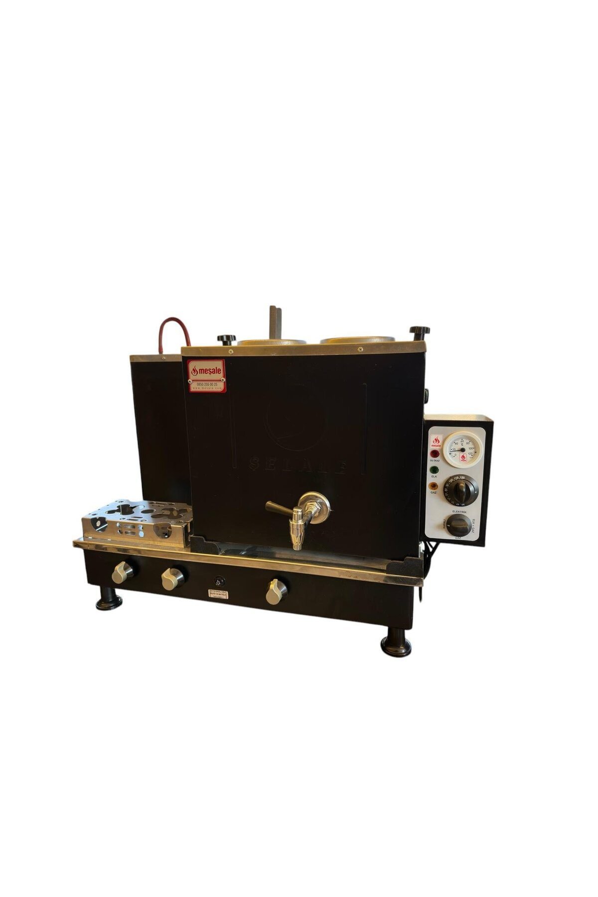 Meşale 2 Demlikli Siyah Şelale Logolu Elektrik + Gazlı Full Otomatik Çay Kazanı, çayınızı her zaman taze ve sıcak tutarken, işletmenize de şık bir hava katacaktır. Yüksek performans ve estetik tasarımı ilebütünleşen bu çay kazanı, müşterilerinize kaliteli bir içecek deneyimi sunar.