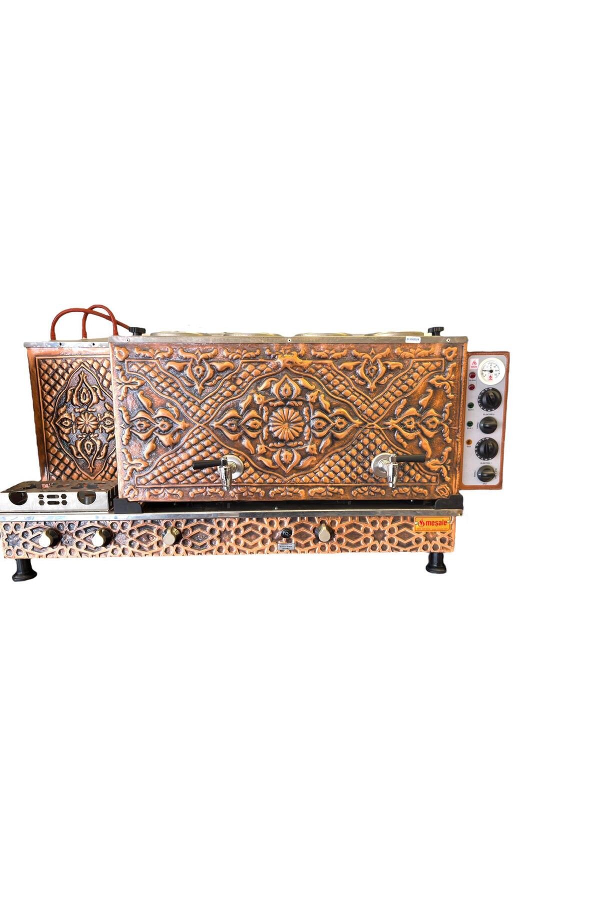 Meşale 4 Demlikli Antik Bakır Meşale Desen Elektrik + Gazlı Full Otomatik Çay Kazanı işletmeler için tasarlanmış yüksek kapasiteli bir çay makinesidir. Yüksek demleme kapasitesiyle hızlı servis sağlar; inox gövdesiyle dayanıklıdır.