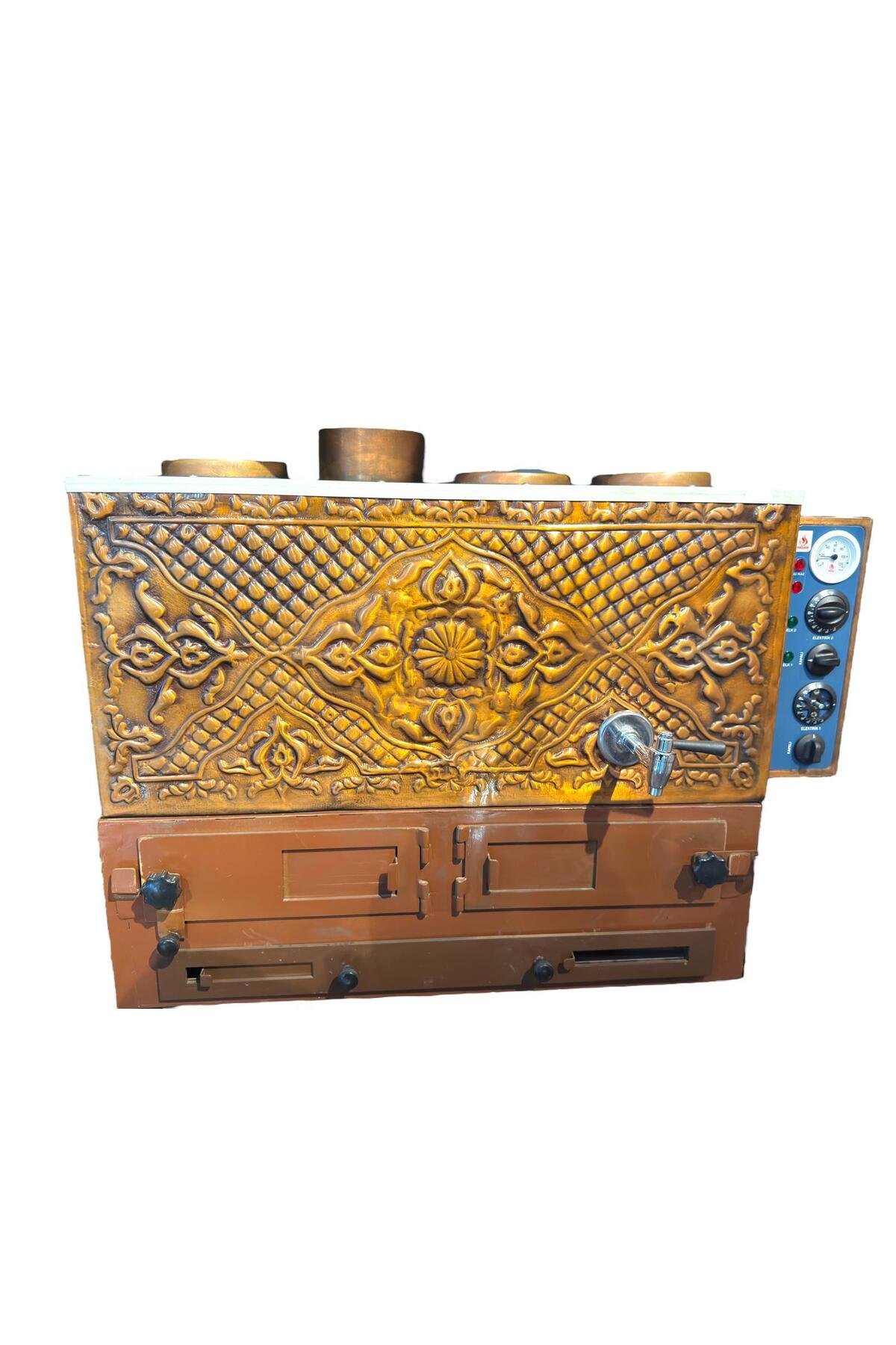 Meşale 3 Demlikli Odunlu İçi Dışı Bakır Çay Kazanı, geleneksel odun ateşiyle çay demlemeyi sevenler için tasarlanmış şık ve dayanıklı bir modeldir. Tamamen bakır malzemeden üretilmiş iç ve dış yüzeyi, ısıyı eşit şekilde dağıtarak çayın uzun süre taze kalmasını sağlar. Odun veya kömürle çalışabilen bu sistem, doğal ve otantik bir çay lezzeti sunar.