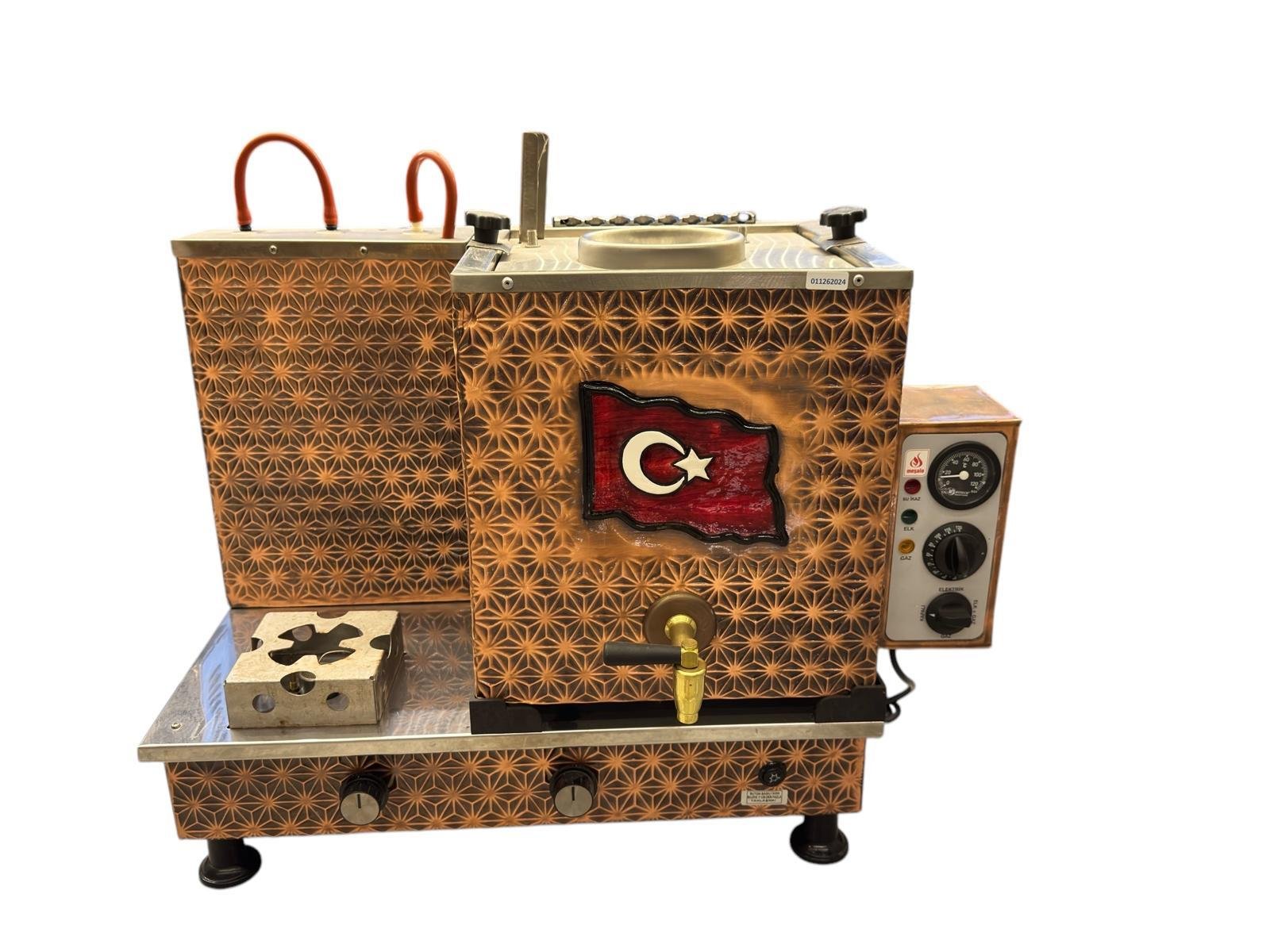 Meşale 1 Demlikli Antik Bakır Türk Bayraklı Elektrik + Gazlı Çay Kazanı işletmeler için tasarlanmış yüksek kapasiteli bir çay makinesidir. Yüksek demleme kapasitesiyle hızlı servis sağlar.
